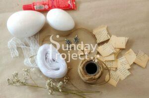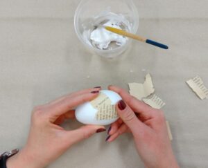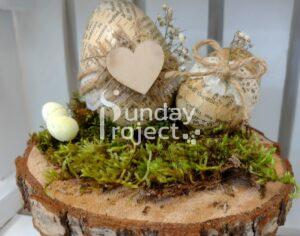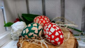 Wykonanie jest bardzo proste! Oklejamy jajo kawałkami kartek. Na koniec klejem na gorąco przyklejamy dekorację. Możemy je umieścić np. na drewnianej podkładce