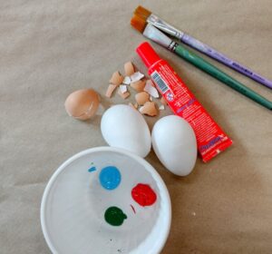 2. Skorupki kruszymy na małe kawałki, każdy smarujemy klejem i przyklejamy do bazy styropianowej